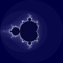 Another computer error captured . For some reason the computer took a flat image (blue), stretched it and added stripes. The distinct shape of the classic Mandelbrot formation makes this image pertinent to a fan of fractals. To date this is my only captured fractal based computer error. All Fractals can be readily reproduced except this freak of circumstances.
